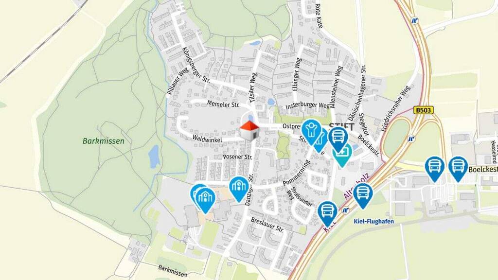Das Wohn- und Geschäftshaus liegt in einer begehrten, familienfreundlichen Gegend in Altenholz, Ortsteil Stift. Die Umgebung bietet eine gelungene Mischung aus Wohn- und Gewerbeimmobilien, mit Grünflächen und Parks in der Nähe. Eine ausgezeichnete Anbindung an den öffentlichen Nahverkehr ermöglicht schnelles Erreichen von Kiel und umliegenden Städten. Familien profitieren von einem Kindergarten in 1 km Entfernung. Einkaufsmöglichkeiten, Gastronomie und Dienstleistungen befinden sich ebenfalls in der Nähe. Dieser Ortsteil vereint urbanes Leben mit Vorstadtidylle.