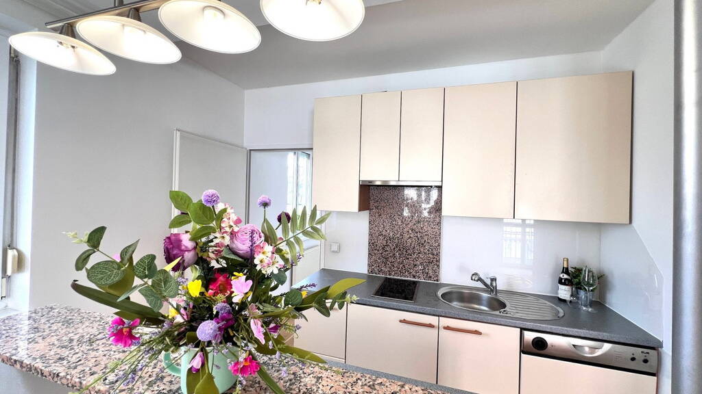 Heller Wohnbereich mit offener Küche, gemütlicher Bar und Ausgang zum Balkon. Separates, kleines Schlafzimmer - ideal für eine ausziehbares Bett.