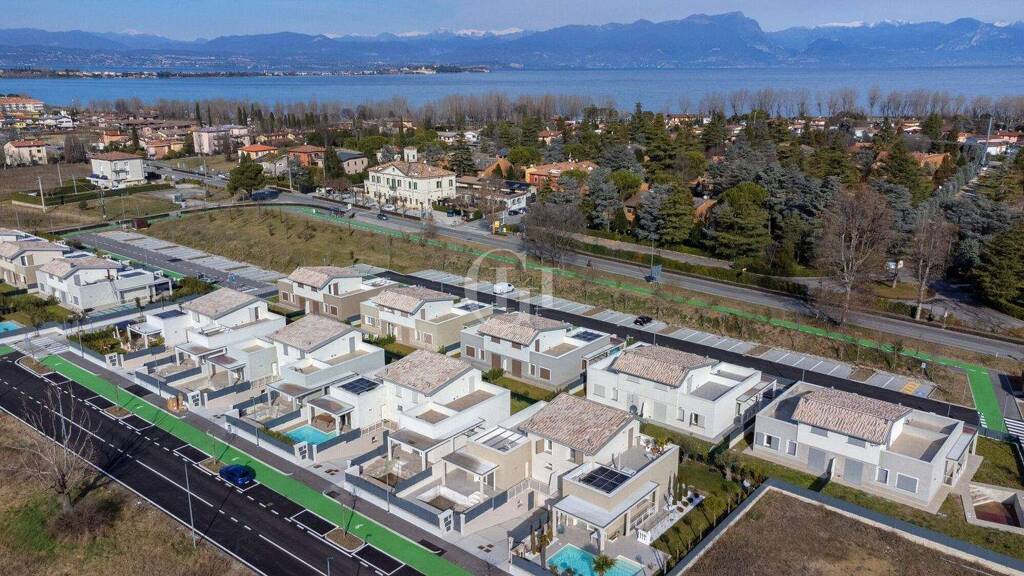 Eingebettet in die Moränenhügel des unteren Gardasees und das kristallklare Wasser des Sees genießt die Villa eine privilegierte Lage zwischen der Via Verona und der Via Chiodi, nur wenige Schritte vom Strand von Punta Grò und nicht weit vom Stadtzentrum entfernt. Das Viertel, das mit Rücksicht auf die Umwelt gestaltet wurde, bietet große Grünflächen, begrünte Parkplätze und von Bäumen gesäumte und gut beleuchtete Fußgänger- und Fahrradwege, die perfekt in die bestehende sanfte Mobilität integriert sind. Die Bushaltestelle ist etwa 100 Meter entfernt, der Bahnhof von Desenzano ist in 15 Minuten zu erreichen, der Flughafen von Verona in 30 Minuten und die Autobahn A4 (MI-VE) in nur 5 Minuten.