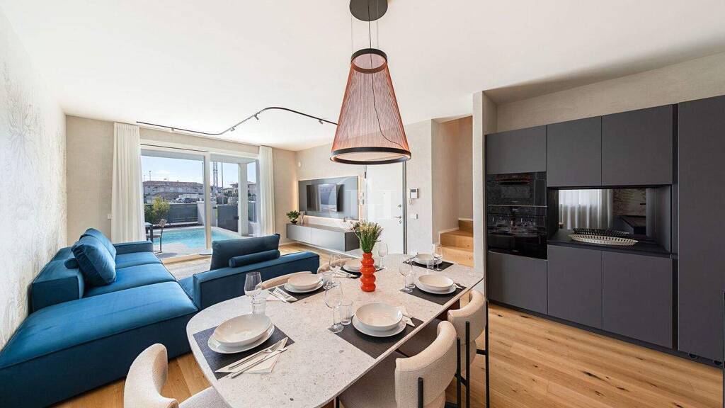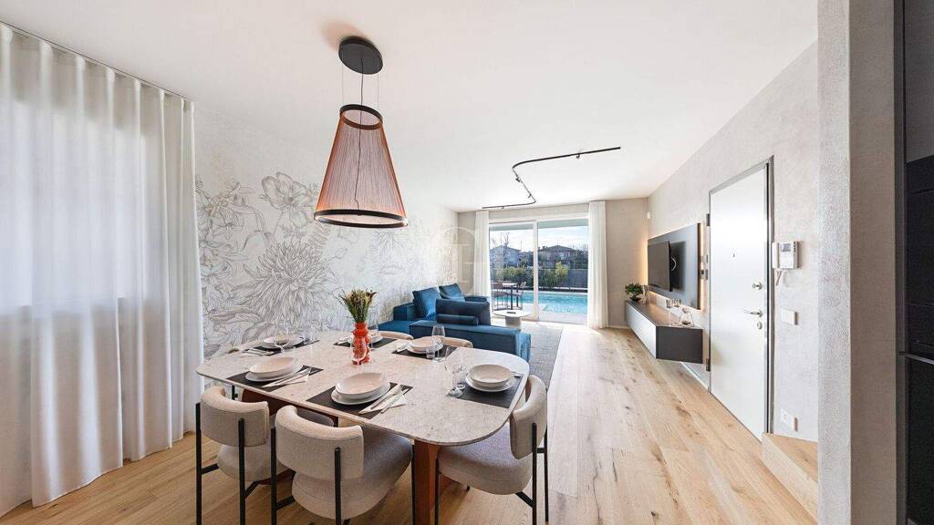 Im Erdgeschoss befindet sich ein großer offener Wohnbereich mit Designerküche und Wohnzimmer, der durch große Fenster, die direkt auf die Veranda und den privaten Garten mit Swimmingpool führen, aufgewertet wird und eine natürliche Erweiterung der Räume nach außen schafft. Auf dieser Ebene befindet sich auch ein Teil des Schlafbereichs mit zwei Schlafzimmern und zwei Badezimmern, von denen eines zur alleinigen Nutzung vorgesehen ist, ideal für Gäste oder um maximalen Wohnkomfort auf einer einzigen Etage zu gewährleisten.