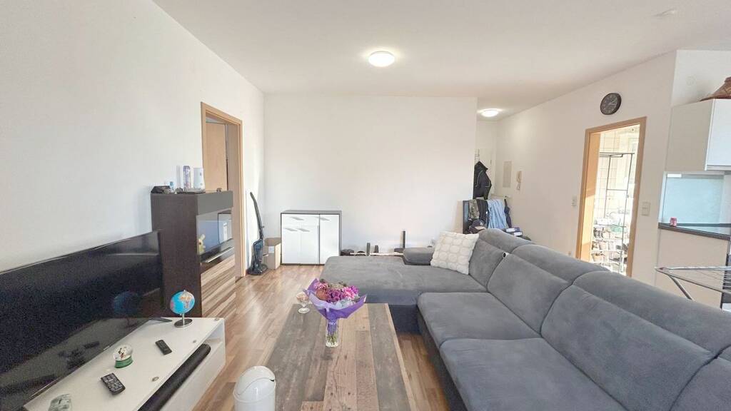 Beim Betreten der Wohnung öffnet sich direkt der offene Wohnbereich, der als Herzstück der Wohnung dient und zugleich Wohn- und Esszimmer vereint. Große bodentiefe Fenster schaffen eine helle, freundliche Atmosphäre und verleihen dem Raum ein großzügiges Wohngefühl.