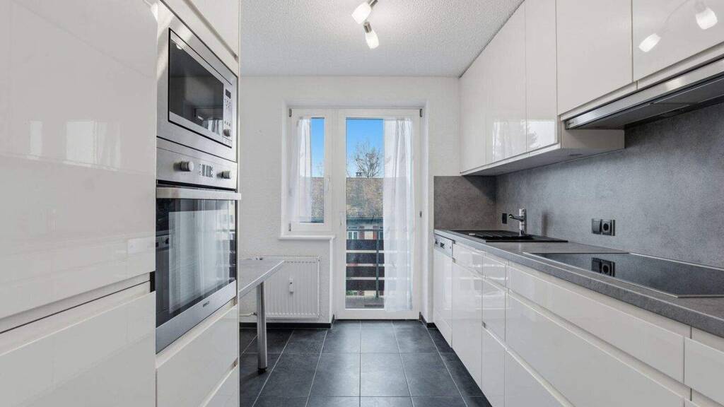 Die moderne Küche bietet alles um leckere Gerichte zu kochen. Die großen Fenster lassen viel Tageslicht herein und schaffen eine helle, freundliche Umgebung.