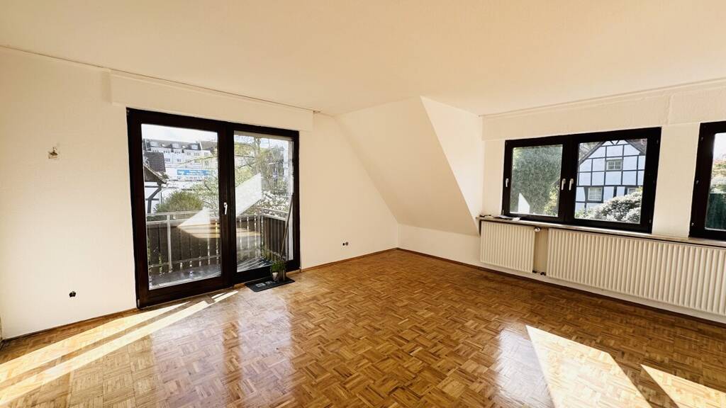 Das Wohnzimmer ist großzügig geschnitten und sehr hell. Große Fenster lassen viel Tageslicht herein, und von hier aus gelangen Sie auf den Balkon, der sich über die Hausseite erstreckt. Der Blick ins Grüne und die ruhige Umgebung laden dazu ein, die Sonne zu genießen oder den Tag entspannt ausklingen zu lassen.