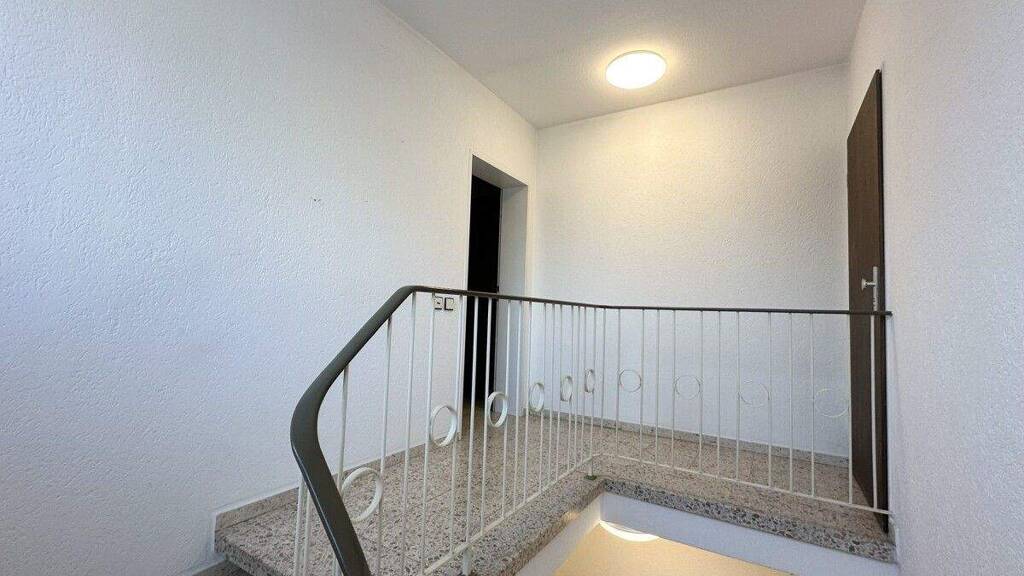 Über das gepflegte Treppenhaus mit stabilem Metallgeländer gelangen Sie bequem zur Wohnung im Obergeschoss. Zur Wohnung gehört ein großer Doppelkeller, der reichlich Stauraum für Vorräte, Fahrräder oder saisonale Gegenstände bietet.