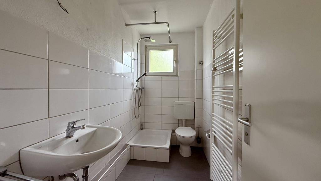 Die ca. 56 m² große Wohnung im Obergeschoss ist aktuell bezugsfrei. Sie bietet drei Zimmer, eine Küche und ein modernes Tageslichtbad mit Dusche, WC und Handtuchwärmer. Ein besonderes Plus: Das darüberliegende Dachgeschoss bietet Potenzial, über eine noch zu installierende Treppe zusätzlichen Raum zu schaffen.