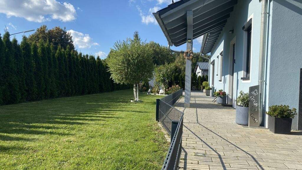 Der Außenbereich besticht durch eine großzügige Süd-West-Terrasse, die sich um das Haus erstreckt. Im Garten befindet sich eine erst kürzlich errichtete Sommerküche und ermöglicht kulinarische Erlebnisse im Freien. Diese eignet sich ideal für entspannte Stunden mit der gesamten Familie.