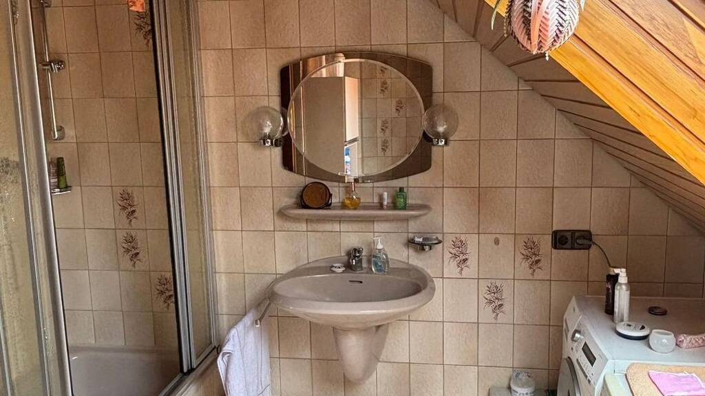 Ins Dachgeschoß gelangt man über eine offene Holztreppe auf einen großen Flur, von dem aus ein Badezimmer mit Dusche und Wanne sowie drei weitere große Schlaf-/Kinderzimmer abgehen. Die Decken im DG sind komplett isoliert und holzvertäfelt.