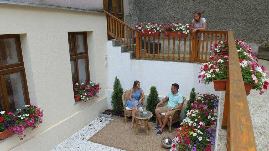 Die Bestandseinheit ist hofseitig orientiert (westseitige Ausrichtung). Der vorgelagerte Garten (Mitbenützung) ist in einem teilweise begrünten, großen Innenhof.