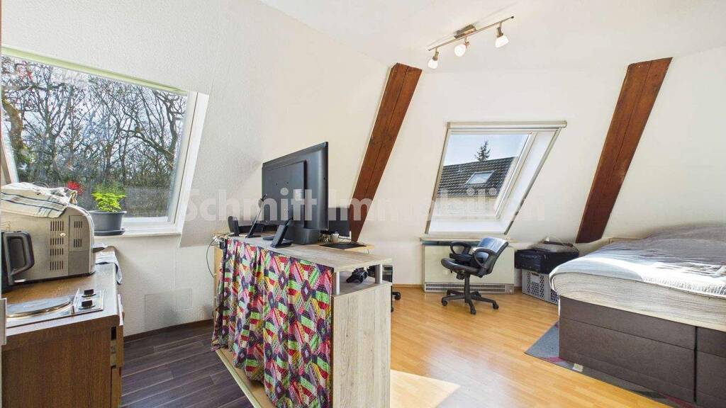 Helle 1 Zimmer-Wohnung mit Küchenzeile, im Dachgeschoss eines gepflegten Mehrfamilienhauses in gehobener Wohnlage von Frankfurt-Schwanheim.