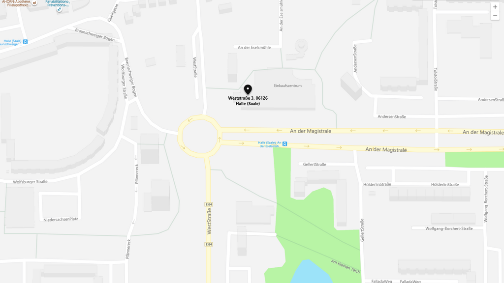 Unser Objekt befindet sich in direkter Lage an der Haupterschließungsstraße des Stadtteils Halle-Neustadt. Durch die nebenan gelegene Eselsmühle ist das Objekt vielen Bewohnern in Halle gut bekannt. Die ausgezeichnete verkehrstechnische Anbindung macht es Ihren Kunden bequem und einfach Sie zu erreichen. Sind es die kostenlosen und direkt von der Hauptstraße zu befahrenden Parkplätze direkt am Objekt oder die S-Bahn Haltestelle direkt vor unserem Haupteingang. Durch die Bundesstraße und Autobahn sind auch weiter entfernte Besucher oder Mitarbeiter schnell bei Ihnen. Die Gesamtschule Heinrich Heine ist ebenfalls im direkten Umkreis und somit im Laufweg vieler Schüler.