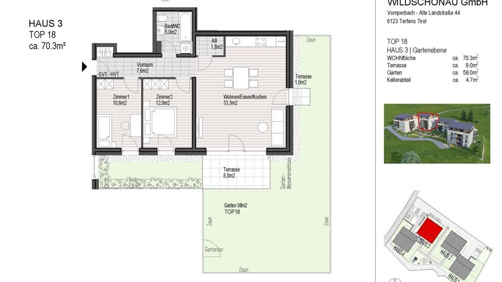 Anzahl Terrassen: 1, Balkon-Terrassen-Fläche: 9,00 m², Gartenfläche: 58,00 m², Kellerfläche: 4,70 m², Bundesland: Tirol, 4 Etagen, Wohnungsnr.: Top 18