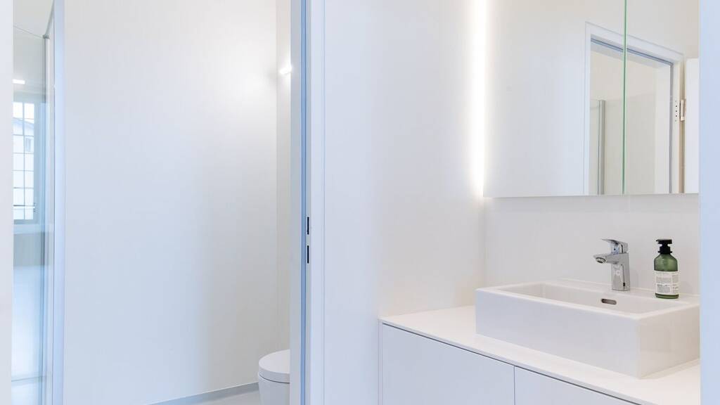 Die Ergeschoss-Ebene mit der offenen Raumgestaltung und Raumhöhen von bis zu ca. 4 Metern eignet sich beispielsweise als Schauraum und Verkaufsfläche. Hier befinden sich eine hochwertige Einbauküche und die Sanitärenanlagen, welche aus zwei getrennten Toiletten und einer Dusche bestehen.