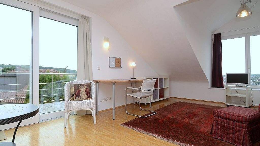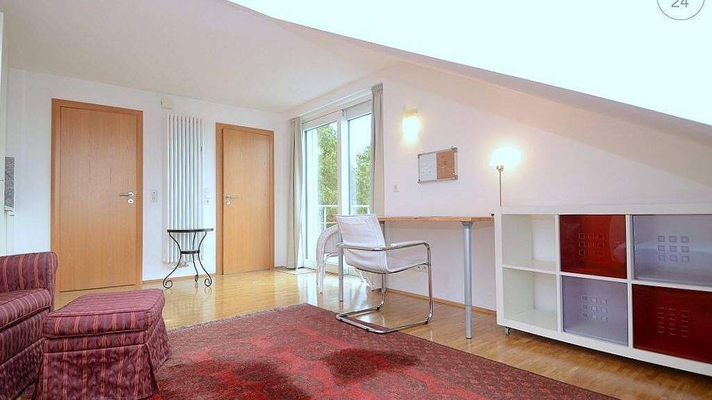 Die ca. 30m² große Wohnung, welche mit Parkettboden ausgelegt ist, befindet sich im 2. Obergeschoss eines Einfamilienhauses und ist über einen separaten Eingang begehbar. Der Wohn- und Schlafbereich ist mit einem 1,20m breiten Bett, Kommode mit TV, Sessel mit Hocker, Schreibtisch mit Bürostuhl, Regal und einem Tisch mit Stuhl möbliert. Die helle Singleküche, welche in den Wohn- und Schlafbereich integriert ist, ist mit einer Mikrowelle, Kühlschrank und sämtlichen Küchenutensilien ausgestattet. Das hell geflieste Tageslichtbad verfügt über eine Dusche, WC und einen beheizbaren Handtuchhalter. Auf dem großen Balkon, kann man die Sonne genießen und den Alltagsstress vergessen. In der angegebenen Miete ist eine Betriebskostenpauschale von 180€ enthalten. Wlan und ein PKW-Stellplatz sind im Mietpreis inkludiert. Eine wöchentliche Reinigung kann gegen Aufpreis dazugebucht werden. Bei Auszug wird eine Endreinigung je nach Aufwand mit der Kaution verrechnet. Die Bushaltestelle ist ca. 5 Minuten fußläufig zu erreichen. Eine Anmietung erfolgt nur an einen Wochenendheimfahrer.