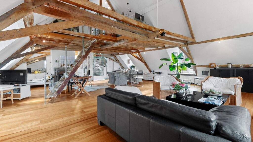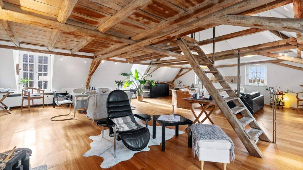 Im Dachgeschoss und Spitzboden befindet sich die großzügige 3,5-Zimmer-Wohnung mit ca. 157 m² mit offener Raumgestaltung und beeindruckender Empore, geprägt von sichtbarem Fachwerk, historischen Holzbalken und modernem Design.
