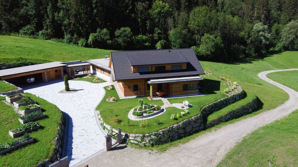 Ein zweigeschossiges Wohnhaus, welches in sehr gehobenen Standard, in Holzbauweise im Jahr 2020 errichtet wurde. WOHNHAUS NUTZFLÄCHE: ca. 264 m² inkl. Einlegerwohnung Die Beheizung erfolgt zentral mit Hackschnitzelheizung, die im Wirtschaftsgebäude untergebracht ist. Das Haus verfügt über Wasserversorgung durch die Gemeinde mit einem kostenlosen Wasserbezugsrecht von 1 l/sec. Das Abwasser wird über eine biologische Kläranlage auf Eigengrund geklärt und abgeleitet. Die Außenanlagen mit beheiztem Naturholzpool ( 10m x 3,5m x 1,4m) sind aufwendig gestaltet. Im Bereich der Hofstellenwidmung befindet sich ein kombiniertes Stall- und Wirtschaftsgebäude. Das Gebäude wurde 2020 errichtet. Im Erdgeschoss befinden sich ein Rinderstall, ein Schweinestall und ein Hühnerstall, sowie die Zentralheizung für die gesamte Hofstelle. Der Heubergeraum ist mit einer Heutrocknung ausgestattet. Dazu wurde eine Dachabsaugung verbaut. Weiters besteht im Verbund mit dem Stallgebäude eine Düngerlagerstätte und zwei Güllegruben, sowie ein befestigter Auslauf für Rinder, Schweine und Hühner. RINDERSTALL: ca. 15m x ca. 11,5 m x ca. 6 m HEULAGER/SCHWEINESTALL/HEIZRAUM: ca. 24 m x ca. 17 m MASCHINENHALLE: ca. 22m x 6m x ca. 4,5m