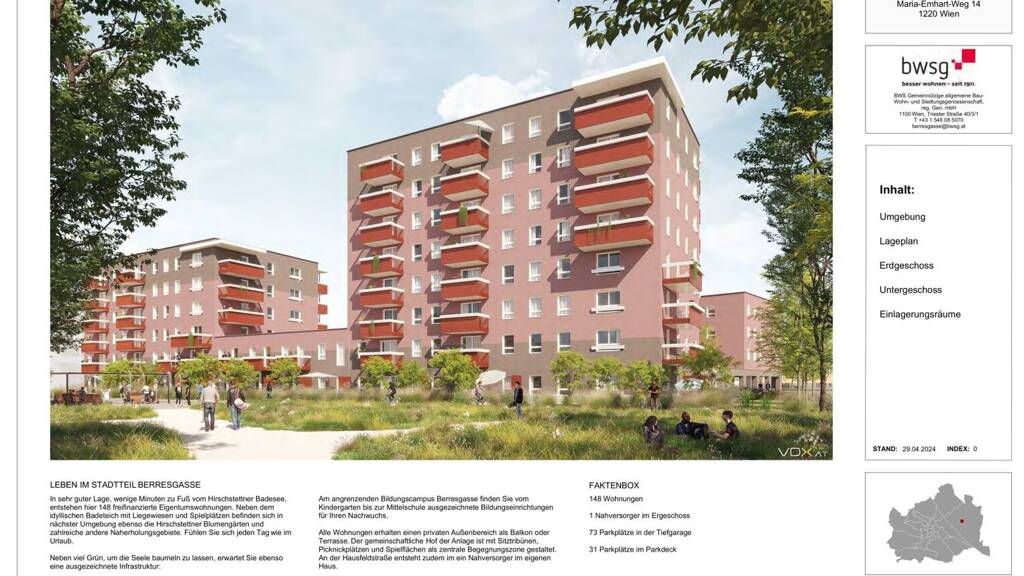 Am angrenzenden Bildungscampus Berresgasse finden Sie vom Kindergarten bis zur Mittelschule ausgezeichnete Bildungseinrichtungen für Ihren Nachwuchs.