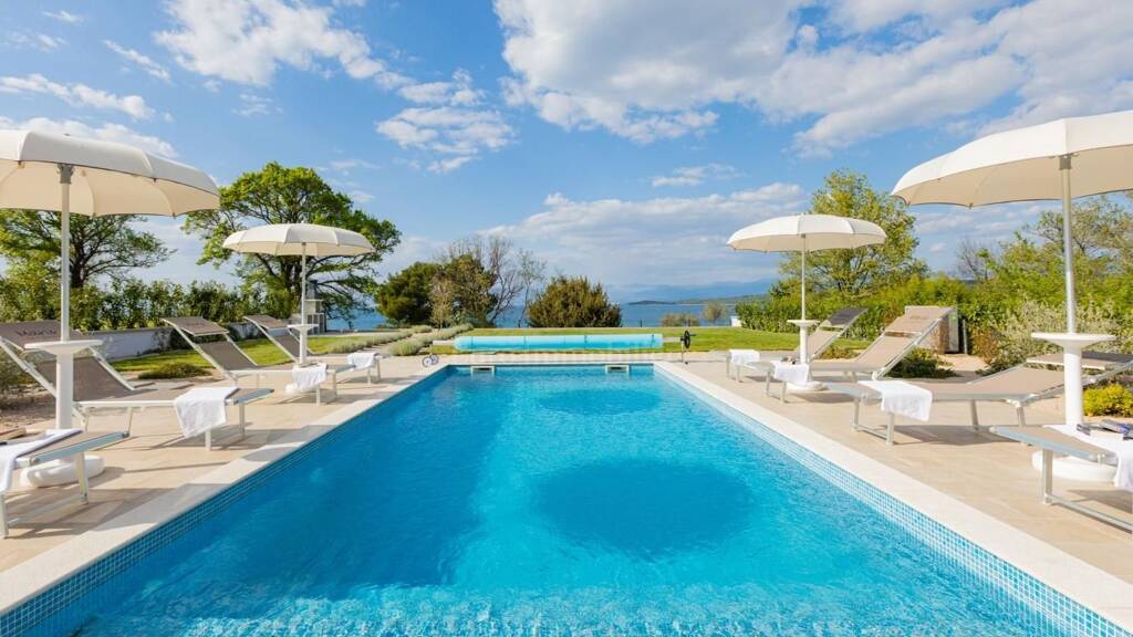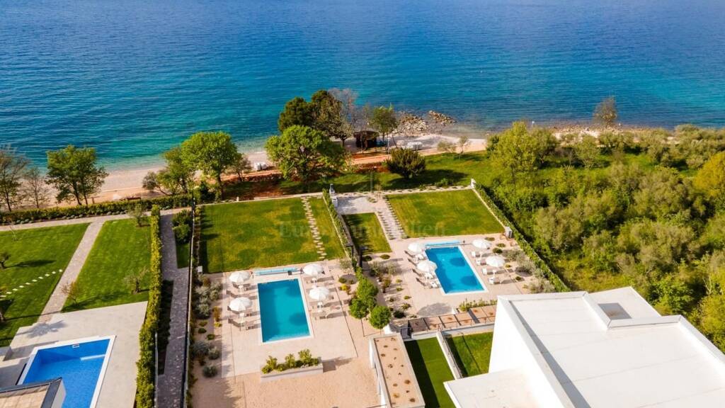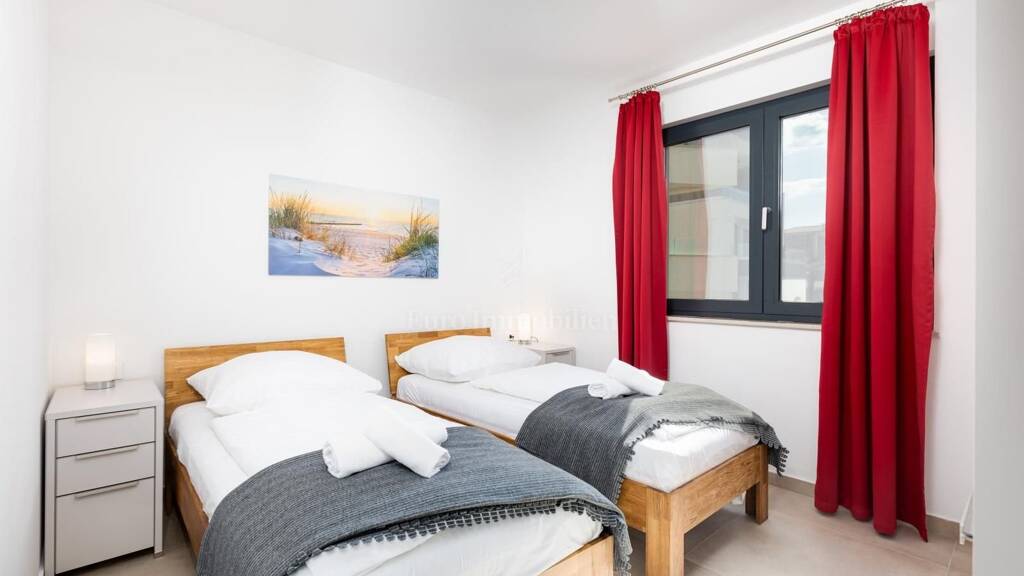 Insel Krk, Malinska - Wohnung in der ersten Reihe zum Meer in einer der besten Lagen in Kroatien! Die Wohnung von 81,42 m2 befindet sich im ersten Stock einer herrlichen Apartmentvilla mit insgesamt 6 Wohnungen, die 2020 gebaut wurde. Es besteht aus einem geräumigen Wohnzimmer mit Küche und Esszimmer, zwei Schlafzimmern, einem Badezimmer, einer Toilette, einem Flur, einem Abstellraum und einem überdachten Balkon. Es wird komplett möbliert und mit hochwertigen Möbeln und Geräten ausgestattet verkauft. Die Wohnung hat einen schönen, freien Blick auf das Meer. Es hat einen Parkplatz. Im gemeinsamen Garten gibt es einen beheizten Swimmingpool mit Liegewiese, Grill und eine Treppe, die direkt zum Strand führt. Eine seltene und prestigeträchtige Lage auf dem Markt!
