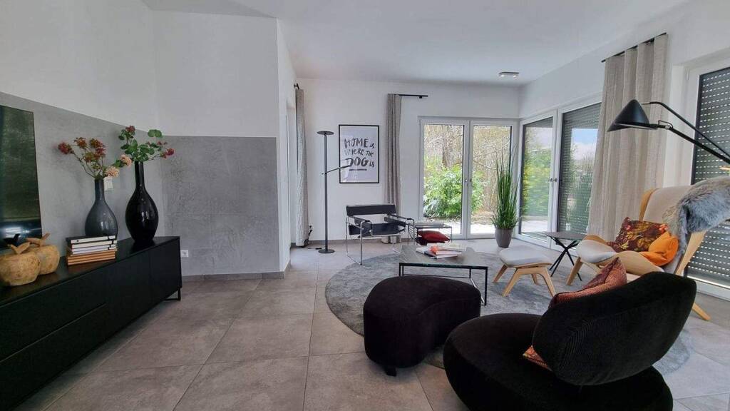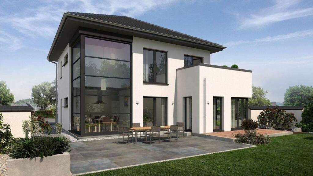 Die zweigeschossige Stadtvilla mit Zeltdach und Erker-Anbau präsentiert sich in schnörkellosem Design. Eyecatcher hier: die 5 Meter hohe Eck-Glasfront. Das Wohnkonzept steht für Offenheit und Transparenz und gewährt gleichzeitig ausreichend Privatsphäre. Zentraler Punkt des Hauses: die offene Treppe. Die Aufteilung in der oberen Etage bietet individuelle Nutzungsmöglichkeiten: Kinder, Büro, Hobby oder Gäste? Alles ist möglich! Der Balkon und das Schlafzimmer mit Ankleide und eigenem Bad runden das Angebot ab. Wer hier wohnt, lebt frei und unbeschwert.