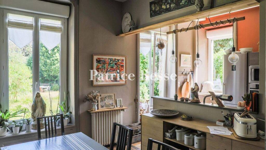 A spacious hallway connects to all the rooms on the ground floor. The ceilings on this ground floor are remarkably high. Wood strip flooring has been preserved. Wooden panelling, painted white, blends harmoniously with wallpaper - some plain, some flowery. Two double doors lead into a vast lounge bathed in natural light. This lounge is a dual-aspect space. The wall's grey tone contrasts subtly with the white hue of the door and window frames and the ceiling mouldings. The lounge features a large fireplace in working order. Its embellished style is classical and typical of historical interiors. It is made of dark, varnished wood with a matt finish. It has a solid base and an imposing trumeau panel ...
