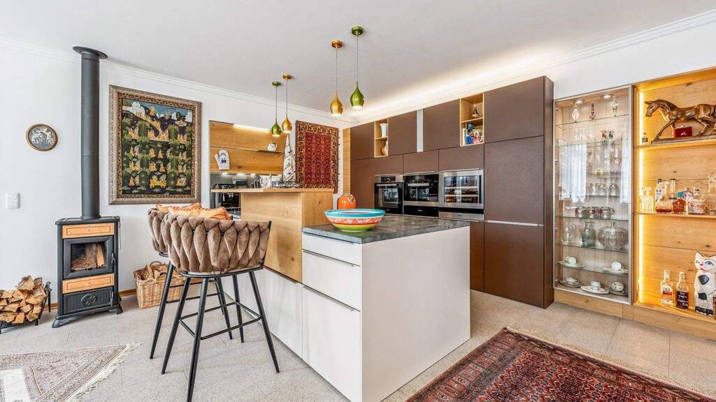 Für besondere Wohnqualität sorgt außerdem ein Holzofen im Wohnraum, der an kühlen Tagen eine gemütliche Atmosphäre schafft und dem Wohnbereich einen charmanten Charakter verleiht.