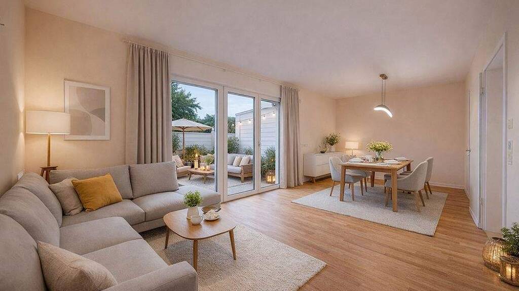Die Küche ist separat angeordnet und bietet einen direkten Zugang zur Terrasse. Ergänzend stehen zwei weitere, flexibel nutzbare Zimmer sowie ein hochwertig ausgestattetes Badezimmer mit bodentiefer Dusche zur Verfügung. Ein separates Gäste-WC sowie ein Hauswirtschaftsraum mit entsprechenden Anschlüssen sorgen für zusätzlichen Komfort und eine klare Organisation im Alltag.