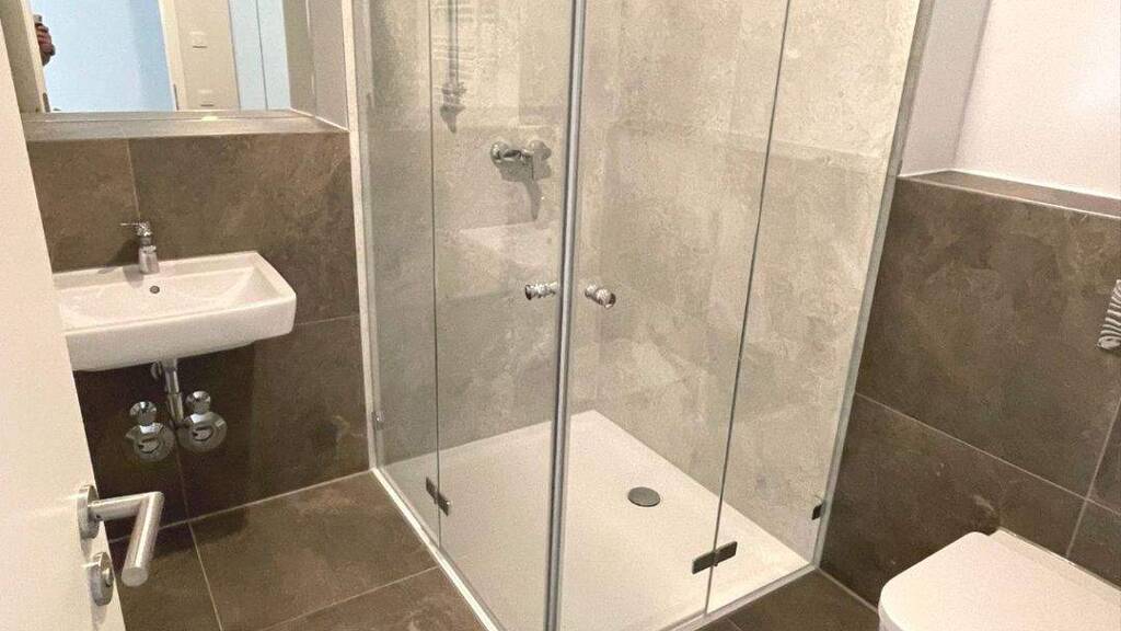 Das Badezimmer überzeugt durch seine moderne Ästhetik und erstklassige Sanitärausstattung. Es ist mit großformatigen Fliesen in stilvollen Grautönen versehen und verfügt über eine bodengleiche, verglaste Dusche, die ein komfortables Duschvergnügen ermöglicht. Zur weiteren Ausstattung gehören ein wandhängendes WC, ein modernes Waschbecken sowie ein Handtuchheizkörper, was den hohen Ausstattungsstandard unterstreicht. Ein praktischer Abstellraum im Eingangsbereich rundet das durchdachte Gesamtkonzept dieser modernen und bezugsfertigen Immobilie ab.