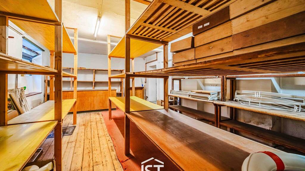 Im linken Bereich führt ein Zugang in ein separates Büro mit angeschlossener Mitarbeitergarderobe – perfekt für administrative Tätigkeiten in unmittelbarer Nähe zum Verkaufsbereich. Der rückwärtige Teil des Lokals beherbergt ein praktisches Lager samt WC. Hier stehen Ihnen noch bestehende Holzregale und ein Packtisch zur Verfügung – ideal für Lagerung und Versand.