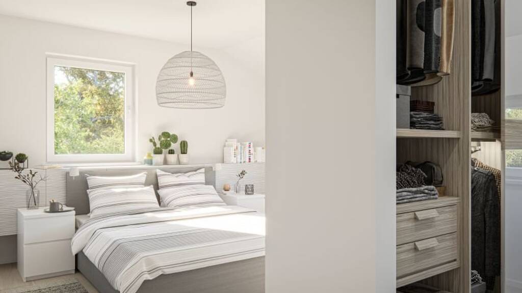 Kompakte Außenmaße und innen viel Platz für die Familie Besonderes Highlight ist im Erdgeschoss das Wohn- und Esszimmer, welches sich über die gesamte Hausbreite erstreckt und direkt an die offene Küche anschließt. Optionale Anbauten sorgen hier für noch mehr Platz und ganz nebenbei für eine moderne Optik. Dem Dachgeschoss mit zwei fast gleich großen Kinderzimmern, Familienbad sowie Elternschlafzimmer mit begehbarer Ankleide stehen für Modernität und Eleganz Die Satteldacharchitektur dieses Einfamilienhauses wird geprägt durch stilvolle und moderne Gestaltungselementen. Farbige Fassadenakzente betonen die ansprechende Gestaltung des Hauses. denn neben den beiden Kinderzimmern, dem Schlafzimmer und dem Bad wird die Etage durch eine Ankleide vollendet.