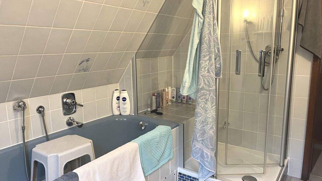 Im Obergeschoss stehen ein Flurbereich, ein weiterer Abstellraum sowie drei flexibel nutzbare Zimmer unterschiedlicher Größen zur Verfügung. Abgerundet wird das Wohnangebot auf dieser Etage durch das geräumige Tageslichtbad mit Badewanne und Dusche, welches 2018 renoviert wurde.