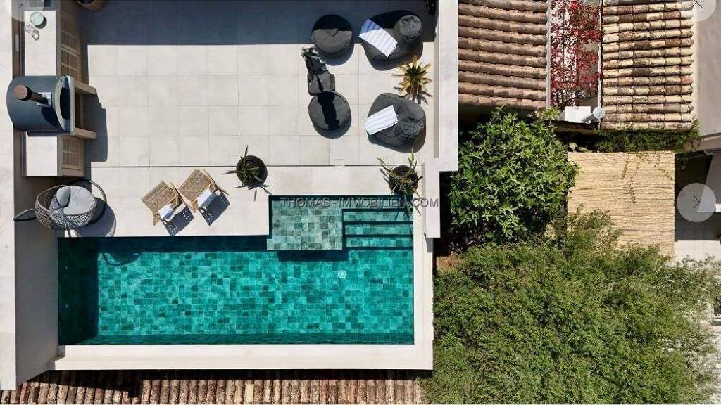 Das Haus erstreckt sich über drei Etagen und bietet ca. 643 m² bebaute Fläche auf einem 261 m² großen Grundstück. Im Inneren befinden sich vier großzügige Schlafzimmer und vier Badezimmer sowie ein fünfter Mehrzweckraum, der als zusätzliches Gästezimmer genutzt werden kann. Die geräumige offene Küche sowie der Ess- und Wohnbereich sind nahtlos miteinander verbunden und führen zu mehreren privaten Terrassen, teils schattig, teils offen - ideal für gemeinsame Stunden mit Familie und Freunden. Die Dachterrasse verfügt über einen privaten Pool mit Sitzbereich und bietet einen herrlichen Blick über das Dorf und die umliegenden Hügel - der perfekte Ort zum Entspannen und Genießen des mediterranen Lebensstils.