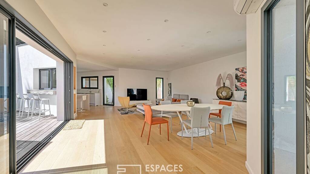 The resolutely warm atmosphere of this villa, the recent quality fittings and the very marked "inside/outside" organization of the places in osmosis with nature, offer a truly exceptional living environment just a stone's throw from the old fortified town and the beautiful wild beaches of Occitanie.
