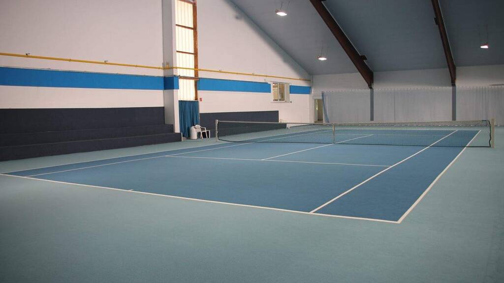 Tennishalle Die Bodenbelag der Tennisplätze besteht aus blauem Teppichboden mit Granulat und dichter Struktur, der mit gelenkschonenden Gummimatten unterlegt ist. Das Absprungverhalten des Balles ist nahezu identisch zum Sandboden.