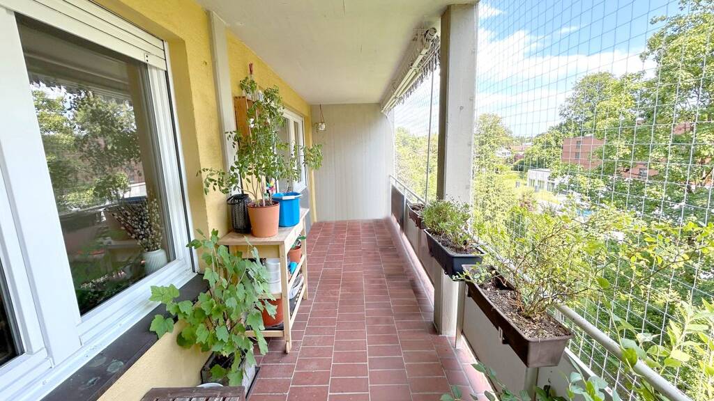 Diese attraktive Etagenwohnung mit einer Wohnfläche von gut 100 m² befindet sich in einem gepflegten Gebäude aus dem Baujahr 1962. Die Immobilie liegt auf der vierten Etage eines vierstöckigen Hauses, also ganz oben und verfügt über eine Zentralheizung. Einen Aufzug gibt es leider nicht. Insgesamt stehen drei separate Kellerräume sowie eine Garage zur Verfügung. Die Wohnung verfügt über zwei Loggien, eine kleine auf der Nord- und eine größere auf der Südseite. Von dieser aus blickt man in das angrenzende ehem. "Büdingen-Areal". Darin befindet sich zwischenzeitlich das "Buff-Medical-Resort". Dieses ist allerdings ausreichend entfernt, sodass man den Altbestand großer Laub- und Nadelbäume vom Balkon aus genießen kann.