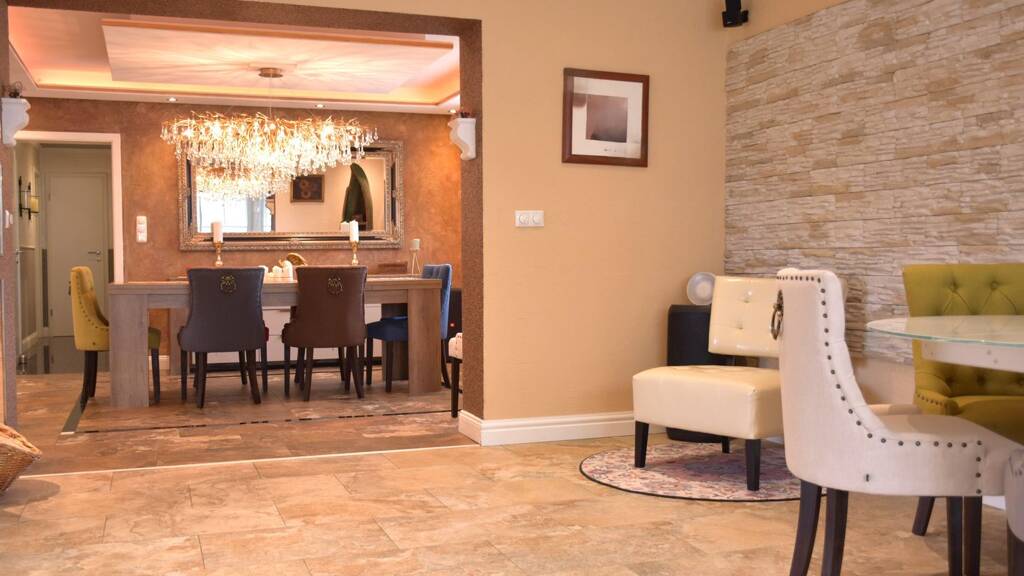 Im Erdgeschoss befinden sich zwei helle Schlafzimmer, eine separate Küche, ein Gäste-WC sowie ein geräumiges Esszimmer. Das gemütliche Wohnzimmer mit Kamin lädt zu entspannten Abenden ein und gewährt Zugang zum großzügigen Wintergarten mit Blick in den Garten. Eine moderne Fußbodenheizung sorgt im gesamten Erdgeschoss für angenehme Wärme und Wohnkomfort.