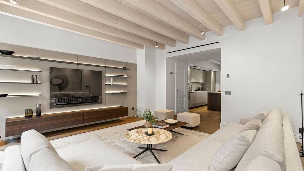 Die offene Raumgestaltung, hohe Decken, sichtbare Holzbalken und große Fenster schaffen ein elegantes, lichtdurchflutetes Ambiente. Zur luxuriösen Ausstattung zählen ein integriertes Klimasystem von Daikin, hochwertige Soundsysteme von Bang & Olufsen, maßgefertigte Designer-Möbel von Poliform sowie weitere stilvolle Elemente namhafter Premium-Marken. Jedes Detail wurde mit viel Liebe zur Qualität und Ästhetik ausgewählt.