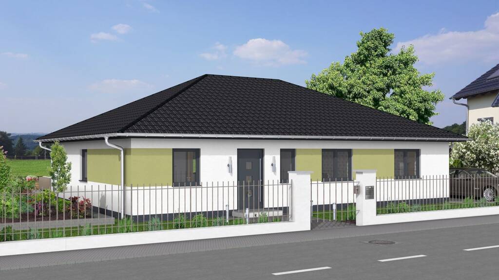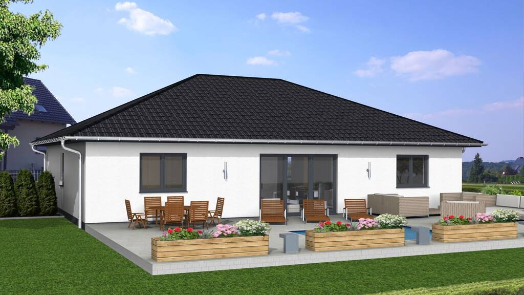 Möchten Sie Ihren Traum eines Eigenheims verwirklichen? Hier sind Sie an der richtigen Adresse! Unser Entwurf VarioClassic 125 für Parzelle 4 (830 m²) präsentiert einen modernen Bungalow, den wir gerne nach Ihren persönlichen Vorstellungen anpassen. Die Wohnfläche von ungefähr 125 m² auf einer Ebene bietet genügend Raum für fünf Zimmer, ein Vollbad, ein Gäste-WC, eine Diele mit angrenzender Garderobe, Küche und einen Hauswirtschaftsraum. Im Mittelpunkt steht das helle, einladende Wohnzimmer mit Essbereich und einer angrenzenden offenen Küche. Großzügige Fensterfronten in allen Wohnräumen sorgen für viel natürliches Licht. Die Terrasse, die vom Wohnbereich aus zugänglich ist, bietet einen idealen Ort zum Entspannen. Das Vollbad ist mit einer bodengleichen Dusche ausgestattet.