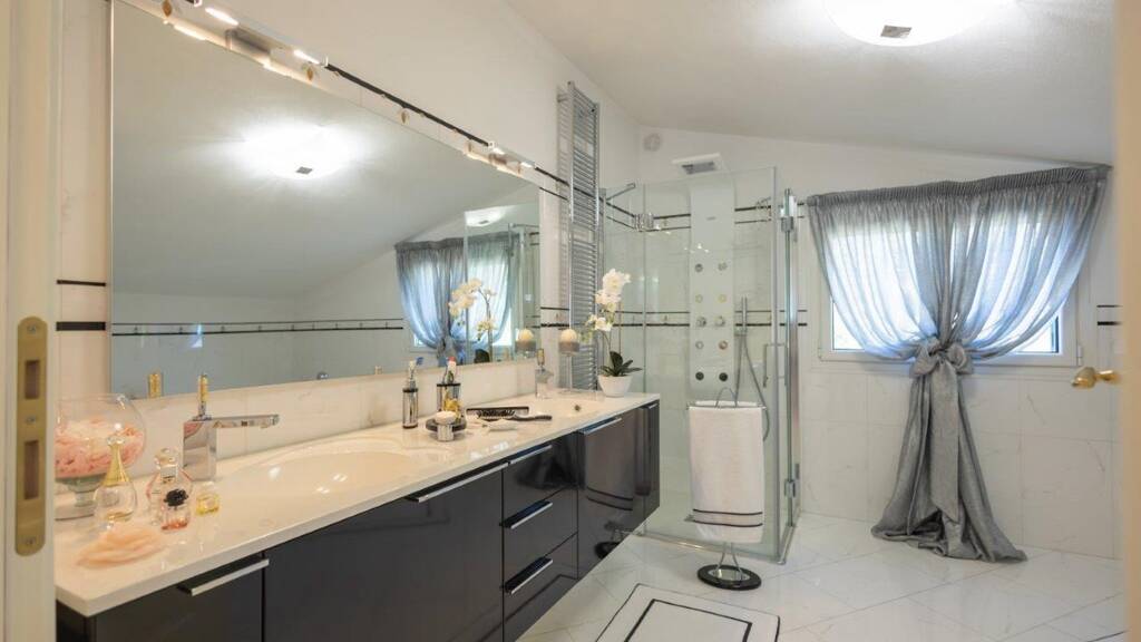 Im Außenbereich laden der schöne Panoramapool und der gepflegte Garten mit Palmen und Olivenbäumen zum Verweilen ein. Ein Autoabstellplatz und eine Doppelgarage runden die Villa Italien ab.