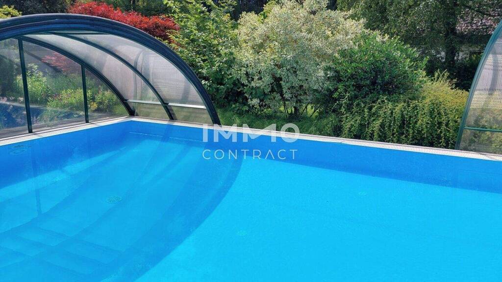 Der Swimmingpool im Garten ist ein Überlaufbecken mit einer Gegenstromanlage und hat eine gläserne Überdachung.