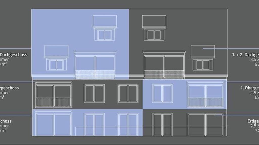 Der Baustart ist bereits im September erfolgt! Haus 2 der Gartenvillen (siehe Plan) Die kleinere der beiden zweigeschossigen Dachwohnungen im Haus 2, ist deshalb jedoch nicht minder attraktiv. Gerade der kuschelig- wohnliche Loungebereich unter der Dachschräge oder die kommunikative Kücheneinteilung am Ausgang zum Dachbalkon, zeigen die positiven Ergebnisse, der umfangreichen Planungsvorarbeiten. Die angenehm zu begehende Treppe in das 2. Dachgeschoss wurde mit einem gekonnten Zusammenspiel aus Design und Nutzwert in das Gesamtkonzept integriert. Auch hier ist im 2. Geschoss ein Bad en Suite geplant, das Gästebad wird mit einer Badewanne und bodenebener Dusche versehen.