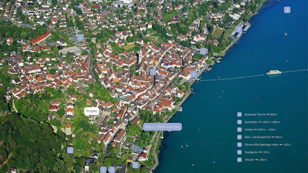Ruhig wohnen, direkt in der Altstadt und den See nur einen Steinwurf entfernt, so lässt es sich leben. Die versteckte Lage in der Gartenstrasse ist auch deshalb besonders attraktiv, weil hier sogar in der Urlaubssaison Ruhe gewahrt bleibt. Bestens geeignet für Menschen, die in der Öffentlichkeit stehen und in ihrer Freizeit anonym bleiben möchten. Geniessen Sie es, an einem lauen Sommerabend auf der Terrasse eines der zahlreichen Überlinger Restaurants zu sitzen und dabei den Blick über den Bodensee schweifen zu lassen- braucht man mehr, um glücklich zu sein?