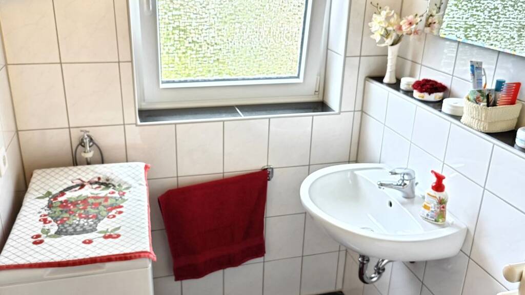 Das Badezimmer ist modern gefliest und verfügt über eine komfortable Duschkabine, ein WC, einen Waschtisch sowie einen Waschmaschinenanschluss.