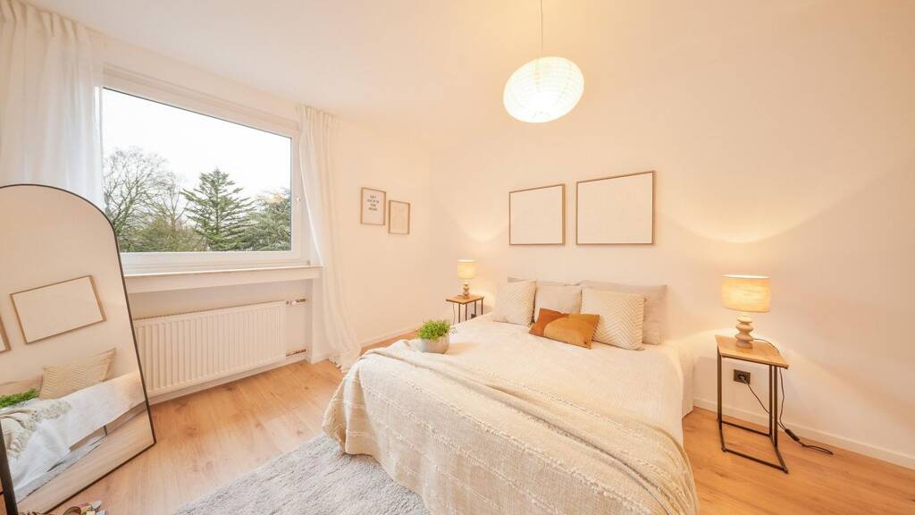 Das Schlafzimmer ist klar strukturiert und bietet einen ruhigen Rückzugsort mit ausreichend Platz für individuelle Gestaltung.
