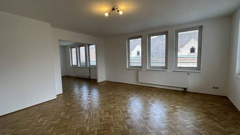 Ganz im Gegenzug zur Küche bietet das Wohnzimmer mit offenem Esszimmer überdurchschnittlich viel Licht. Dank der vielen, nach Osten und Süden ausgerichteten Fenster und dem erstklassigen Parkettboden sind diese beiden Räum überaus hell und freundlich. Vom Esszimmer aus gelangt man über einen kleinen Gang in das Schlafzimmer. Dieses ist ca. 15 m² groß und aufgrund der hofseitigen Lage sehr ruhig.