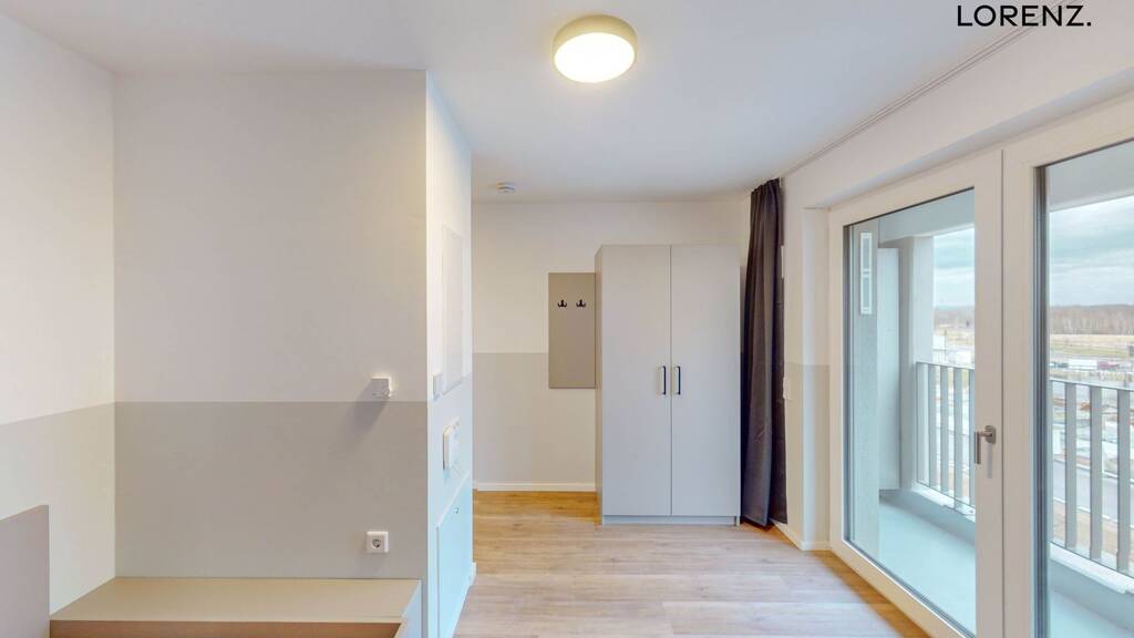 Toll geschnitten, mit praktischer Nische fürs Bett, lädt das große Wohnzimmer mit integriertem Kochbereich und schöner Loggia zum Relaxen ein. Ein schickes Badezimmer mit bodengleicher Dusche komplettiert das 1-Zimmer-Apartment. Ausgestattet ist das Apartment u.a. mit einem Bett, einem Schreibtisch, Kleiderschrank und Garderobenhaken.