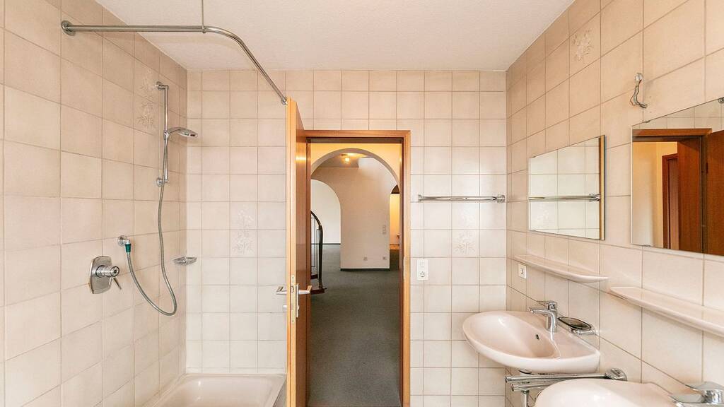 Sanitär: Bad mit Badewanne, Dusche, 2 Waschbecken, Toilette
