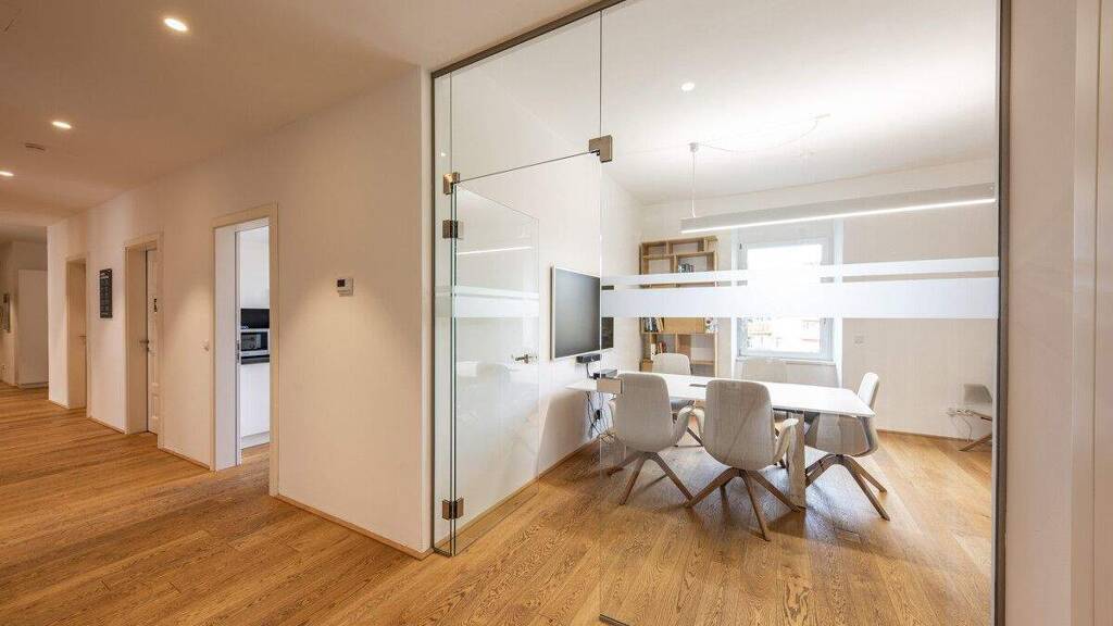 Dieses vollständig renovierte Stadtbüro im 3. Obergeschoss eines eleganten Innsbrucker Stadthauses (mit Lift) überzeugt durch seine großzügige Raumaufteilung, hochwertige Ausstattung und die zentrale Lage in der Innenstadt. Auf insgesamt ca. 180 m² stehen Ihnen vier große, lichtdurchflutete Büroräume mit Ausrichtung nach Südosten zur Verfügung - ideal für mindestens vier Arbeitsplätze. Ergänzt wird das Angebot durch einen großzügigen Besprechungsraum, perfekt geeignet für Meetings, Präsentationen oder Teamarbeit. Ein maßgefertigter Abstellraum mit hochwertigem Tischlermobiliar schafft zusätzlichen Stauraum. Die gemütliche Teeküche bietet Zugang zu einem hübschen Balkon in den ruhigen Innenhof, ideal für kurze Pausen. Außerdem verfügt das Büro über Toilettenanlagen sowie einen praktischen Garderobenbereich. Die jüngst erfolgte Renovierung sorgt mit schönen Holzböden, modernen Schallschutzelementen und einem klaren, zeitgemäßen Design für ein angenehmes und professionelles Arbeitsumfeld.