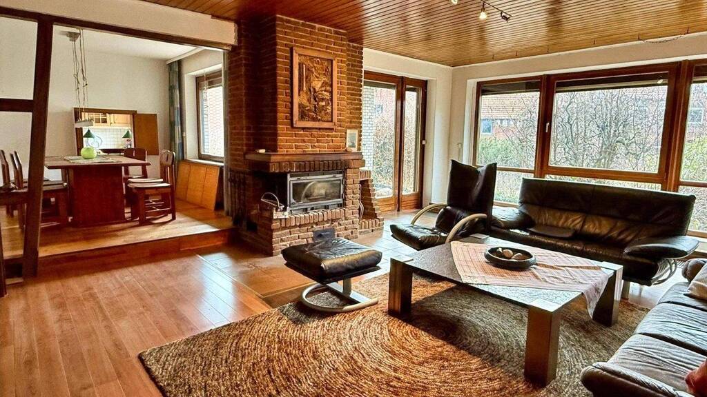Sie betreten die Immobilie über den hell gefliesten Windfang, hier befindet sich die Garderobe und das ca. 1990 erneuerte Gäste-WC. Weiter geht es in die Diele, von der Sie alle Räume erreichen. Das Herzstück des Wohnbereichs bildet das offen gestaltete Wohn-/Esszimmer mit Kamin und breiter Fensterfront, die den Blick in den Garten öffnet. Von hier gelangen Sie auf die Terrasse und in den Garten.