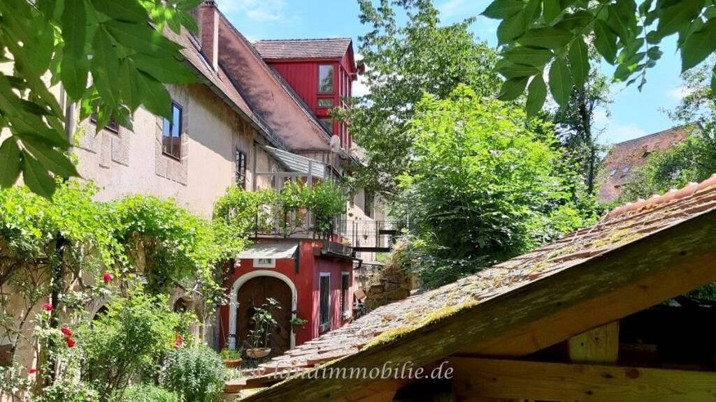 Gartenfreunde und Ruhesuchende finden auf dem an das Haus angrenzenden Grundstück ein wahres Paradies. Sichtgeschützt bis uneinsehbar erstreckt es sich hinter dem Gebäude bis direkt an den Ortsrand bzw. den renaturierten Mühlkanal der Wörnitz – natürlich mit eigenem Bootssteg! Durch die Neuanlage nach Planung der Eigentümer untergliedert sich das weitläufige Grundstück in einen landschaftsparkartigen Garten mit überdachtem Freisitz zur Wörnitz hin und einem weitläufigen Bauerngarten mit Blumenbeeten, Rasen, Obst- und Gemüsebeeten, der an die alte Schlossmauer grenzt. Eine in der Nachbarschaft liegende Scheune mit großzügigen Stell- und Lagerflächen kann auf Wunsch für weitere 50.000,- Euro erwoben werden.