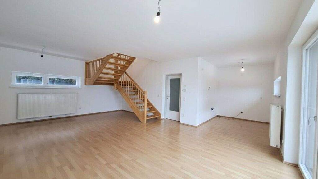 * Erdgeschoss: Großzügiger Wohnbereich mit integrierter Kochnische und großer Fensterfront mit Blick in den Garten Direkter Zugang zur teilweise überdachten Terrasse - ideal für entspannte Stunden im Freien Vorraum, separates WC und Abstellraum Hochwertige Holzstiege ins Obergeschoss