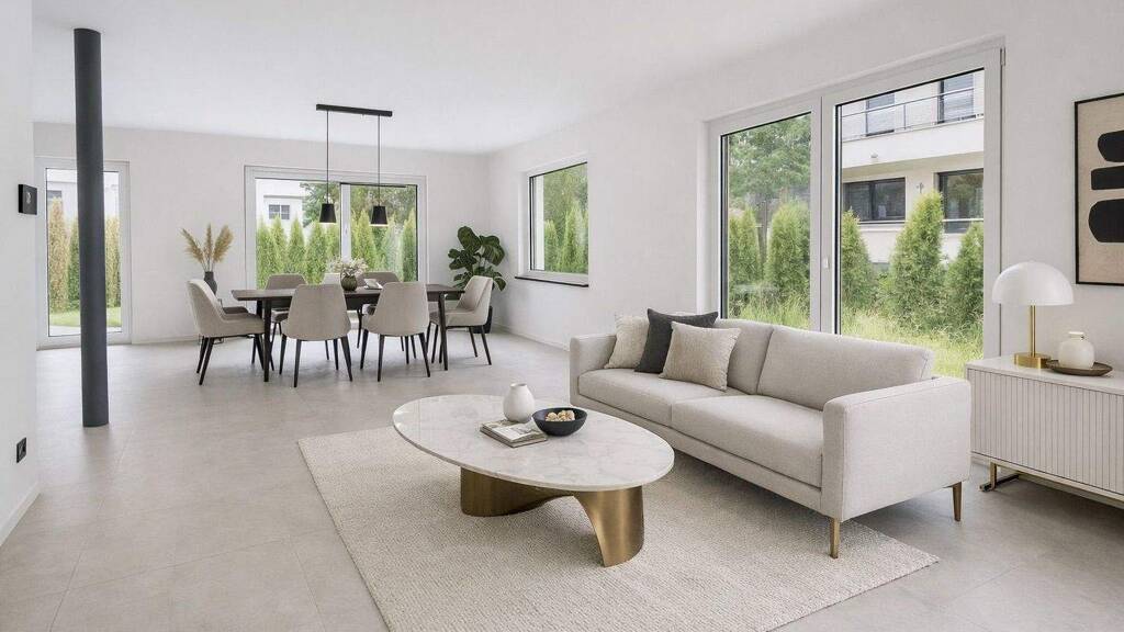 + Architektur: Moderne Neubauvilla mit großzügigen Fensterflächen, lichtdurchfluteten Räumen und klarer Linienführung